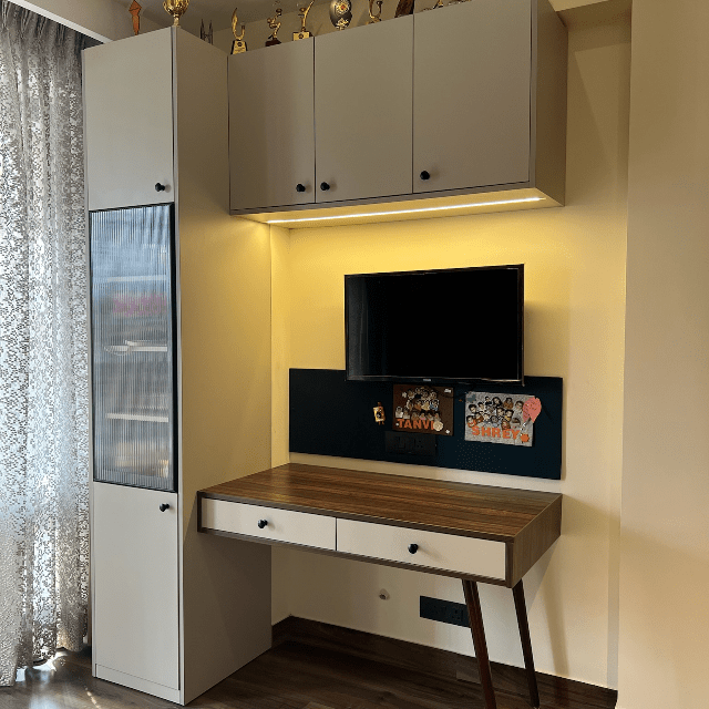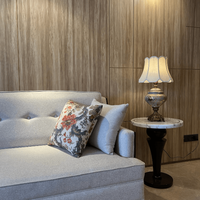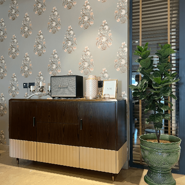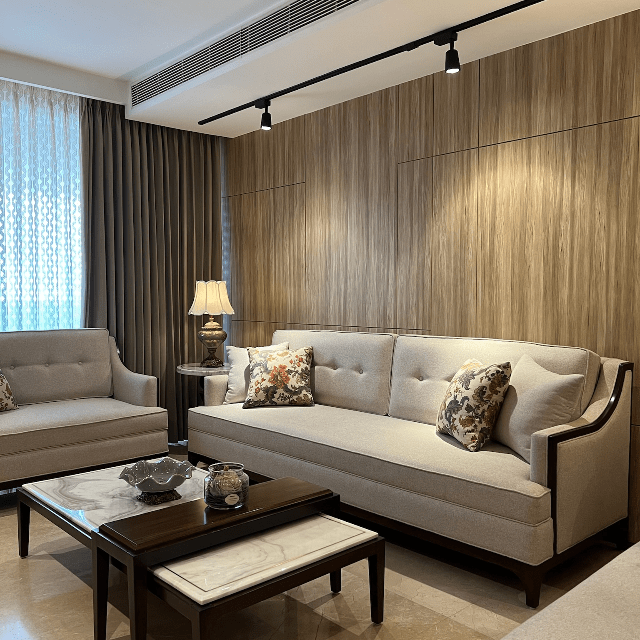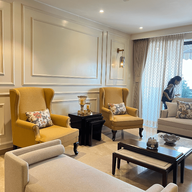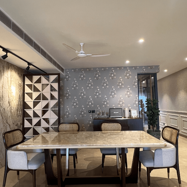 Explore a home that feels like your own personal retreat. The living room furniture has vibrant colours to complement the neutral hues of the interior. On the other hand, the stone-top table and the rattan chairs in the dining area represent traditional aesthetics. Experience the essence of classic interior decor with contemporary accents only at Lakkadworks.
