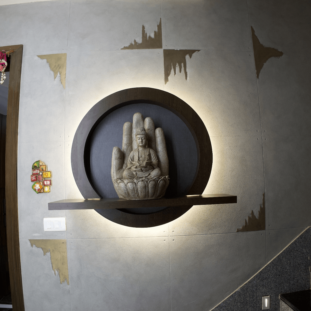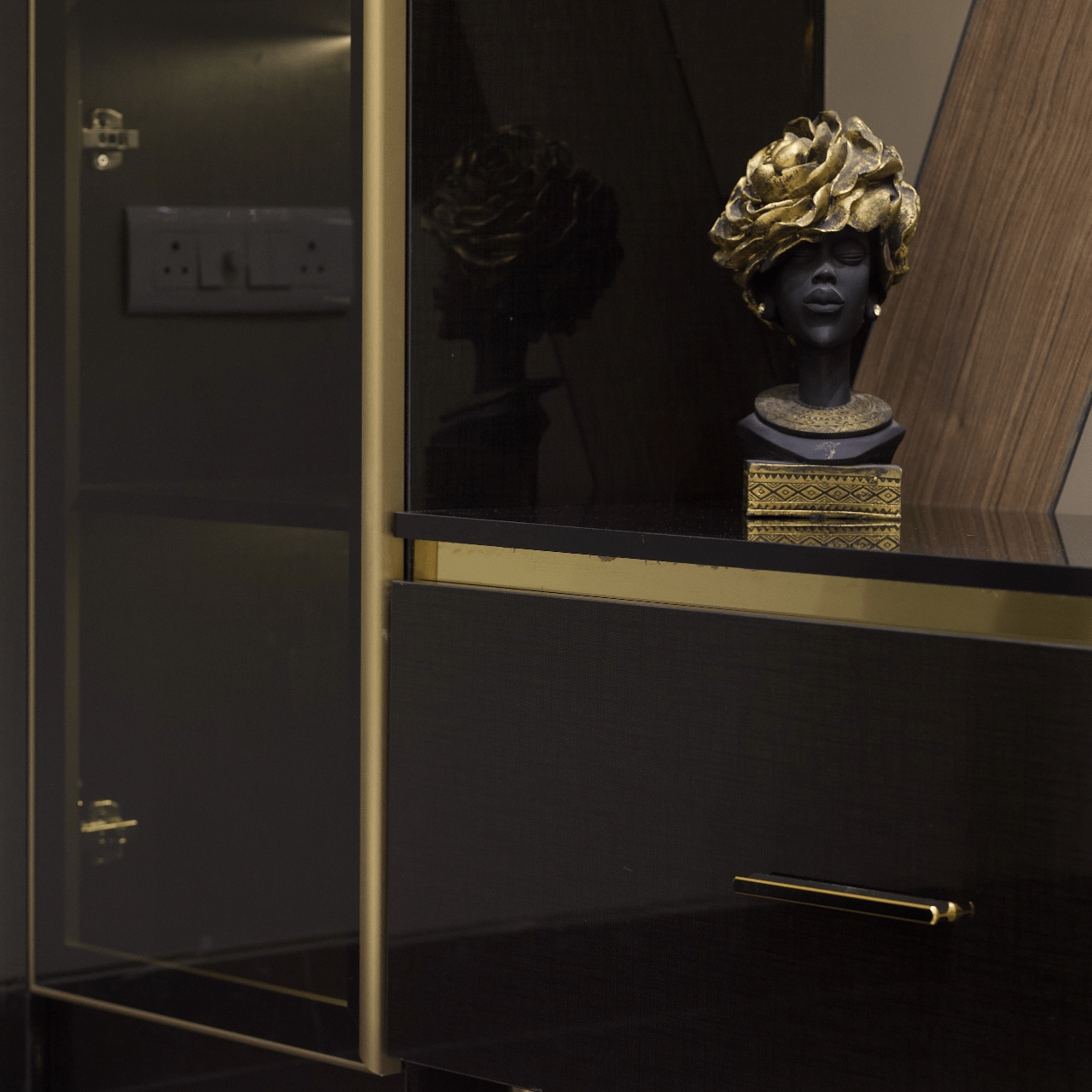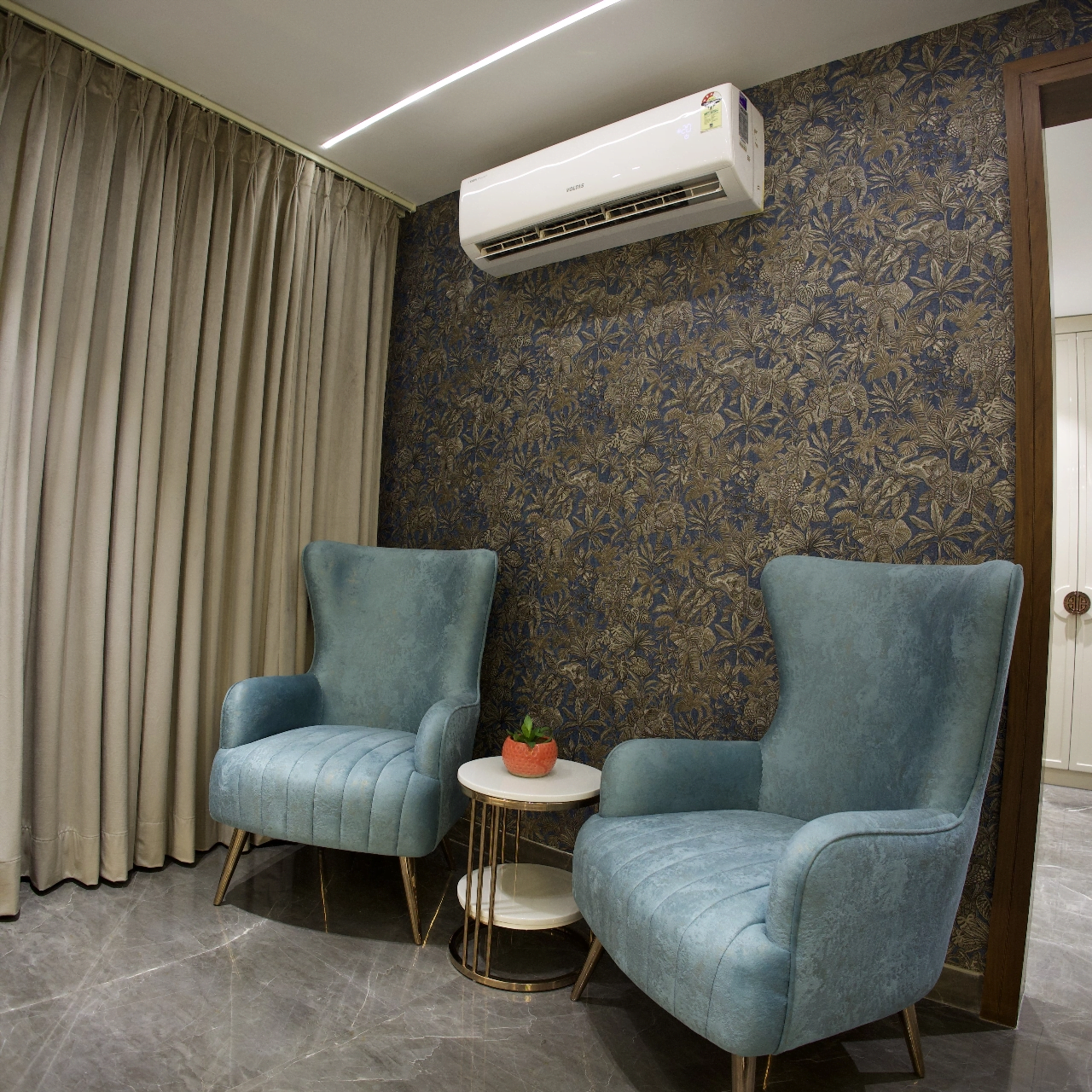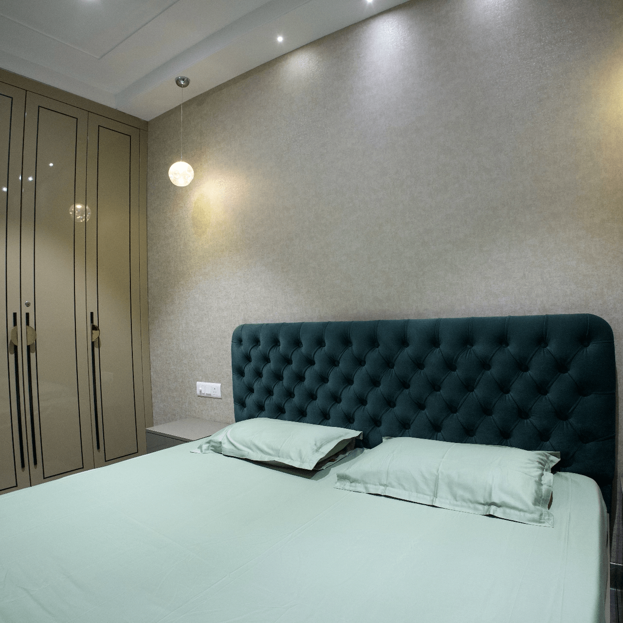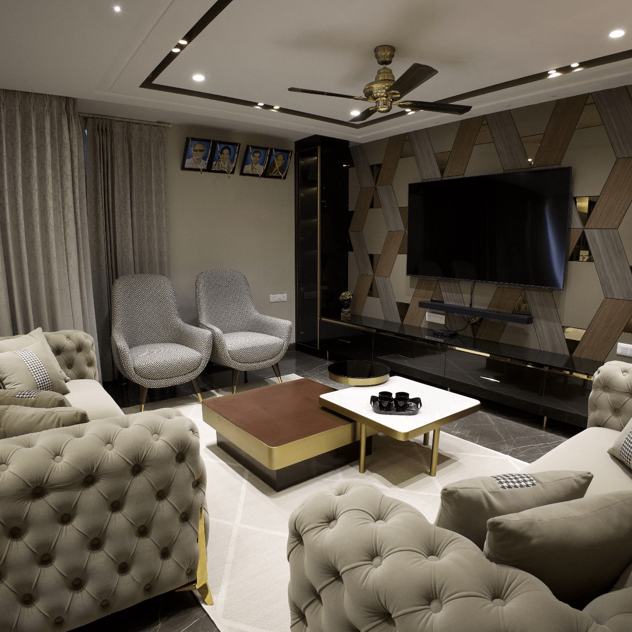 Explore our luxurious turnkey interior project in the heart of Delhi. While our customised grand Chesterfield sofa, chic chevron-printed accent chairs, and a sleek, larger-than-life TV unit have complemented the creative interior of the living room, the dining area offers more of a rustic appeal with stunning stone-clad walls. With a corian stone backdrop, the mandir area shines with decorative lighting. We have also designed customised interiors for every bedroom, along with functional wardrobe interiors. Get a taste of personalised luxury interior decor only at Lakkadworks!