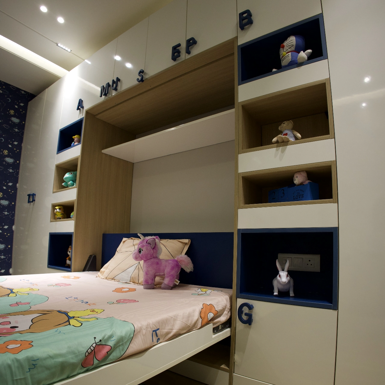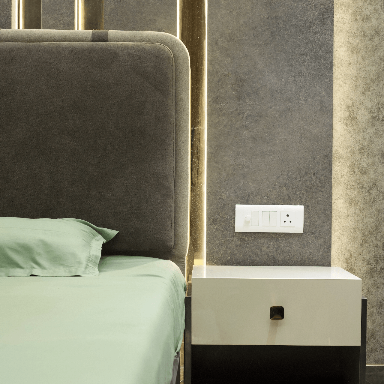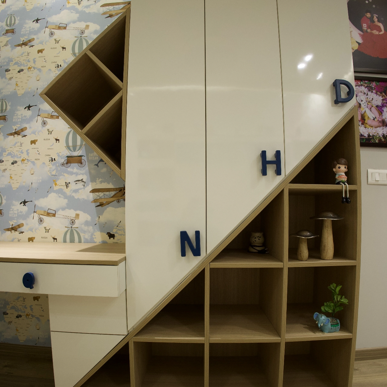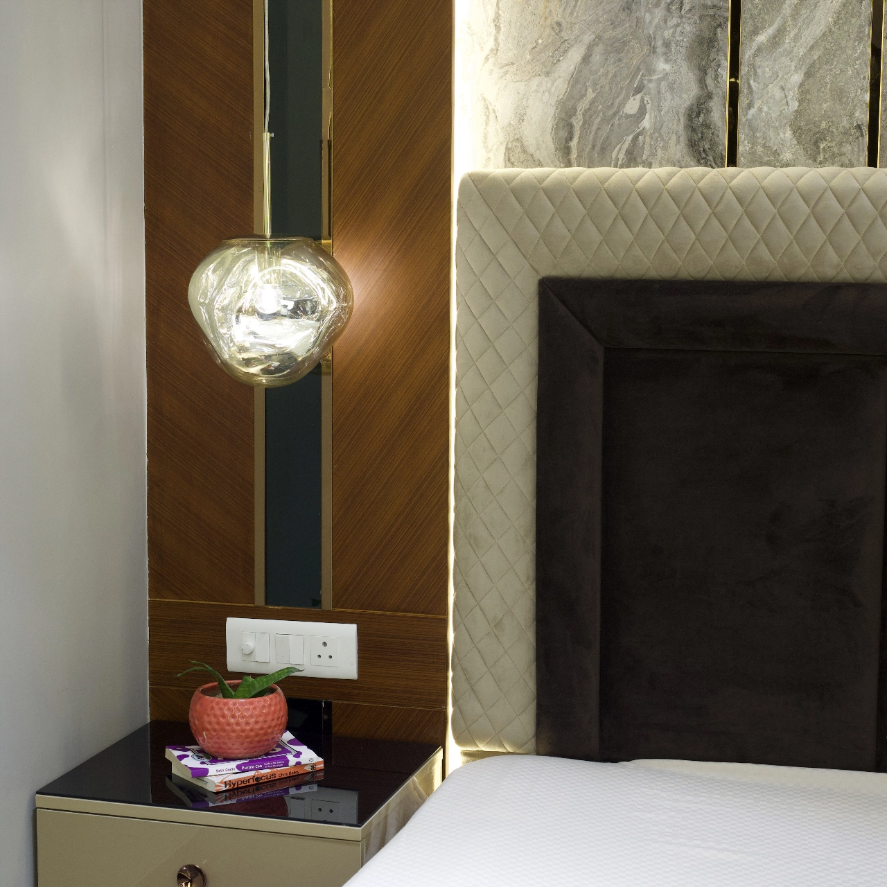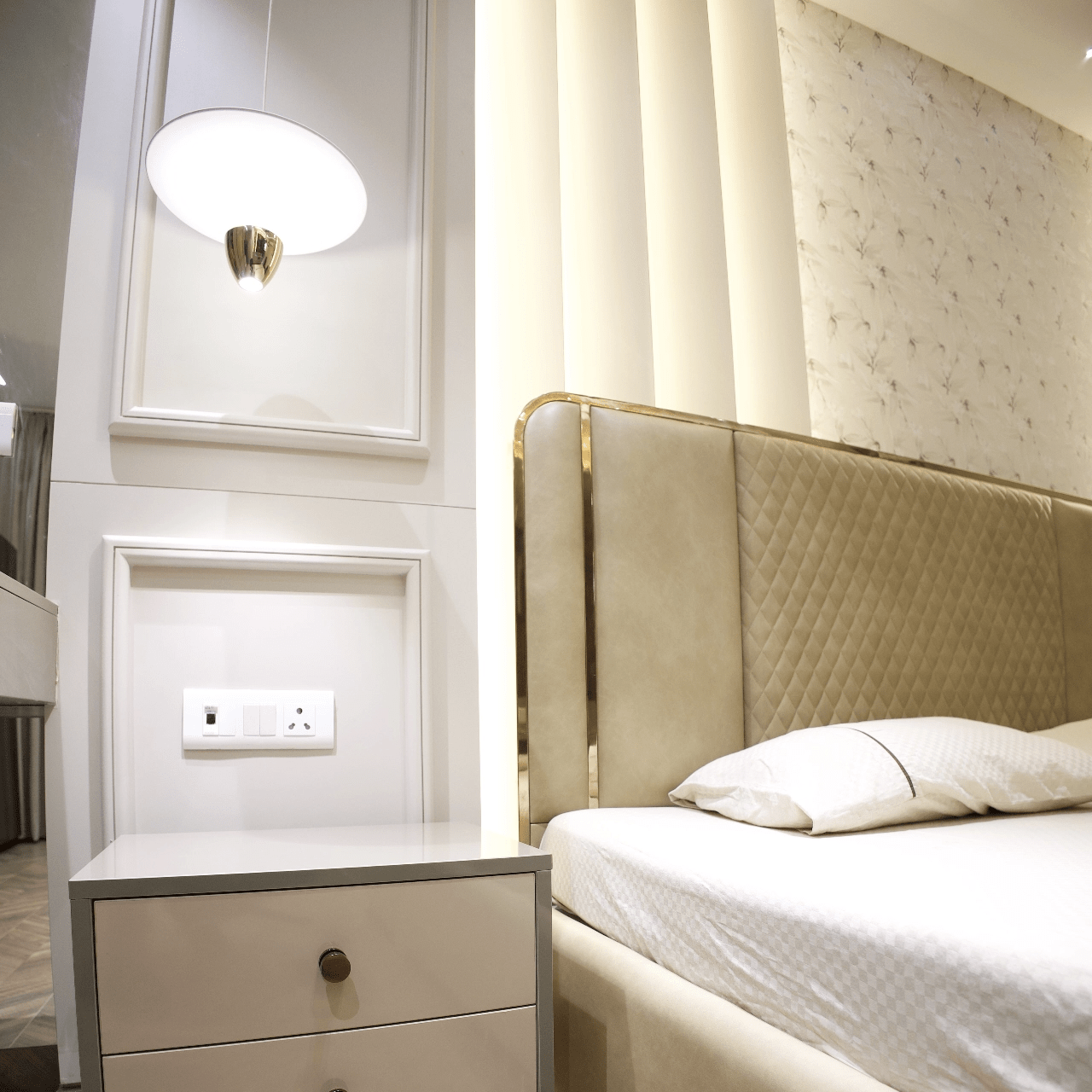 Explore our luxurious turnkey interior project in the heart of Delhi. While our customised grand Chesterfield sofa, chic chevron-printed accent chairs, and a sleek, larger-than-life TV unit have complemented the creative interior of the living room, the dining area offers more of a rustic appeal with stunning stone-clad walls. With a corian stone backdrop, the mandir area shines with decorative lighting. We have also designed customised interiors for every bedroom, along with functional wardrobe interiors. Get a taste of personalised luxury interior decor only at Lakkadworks!