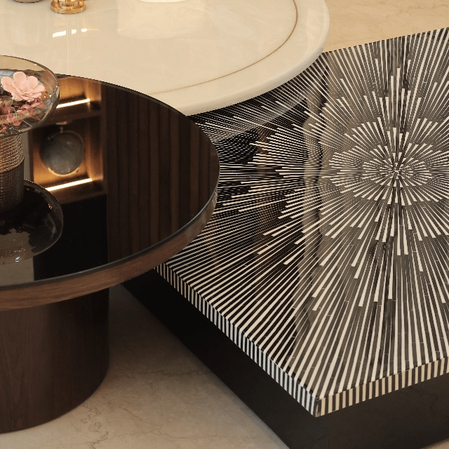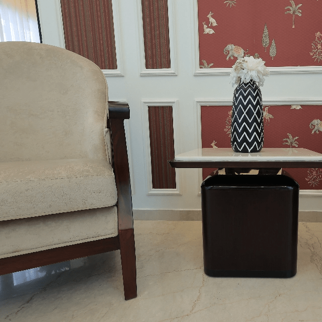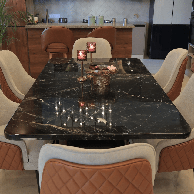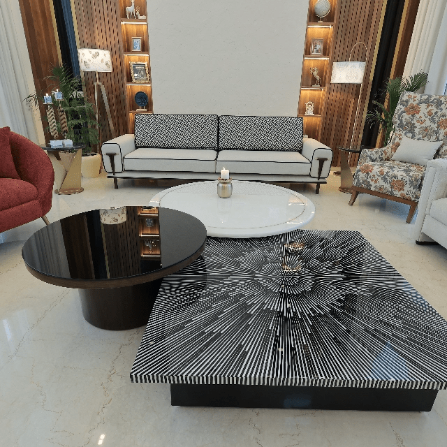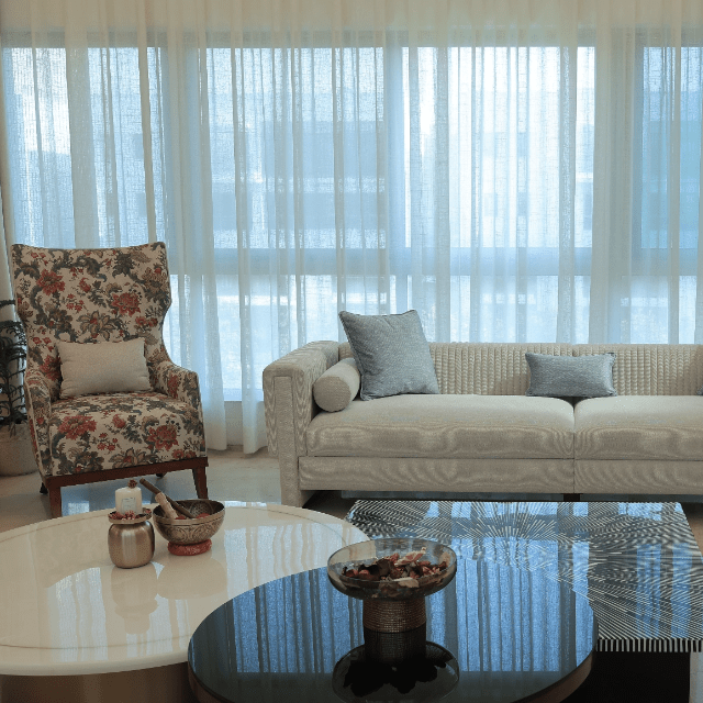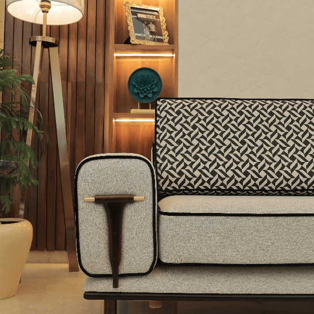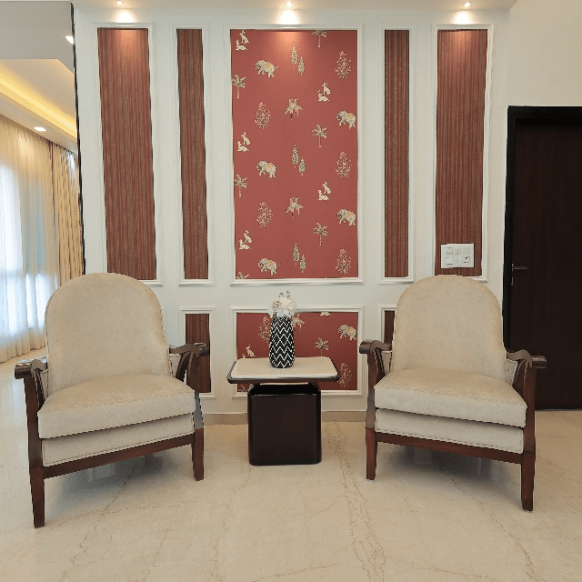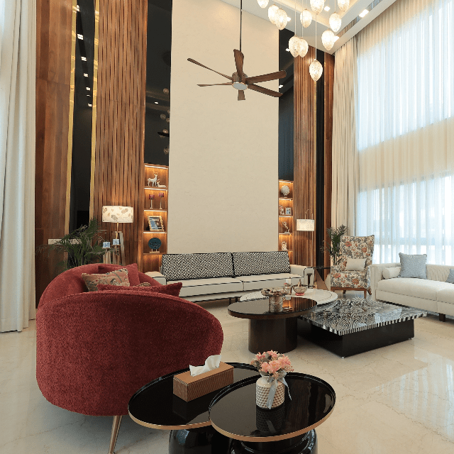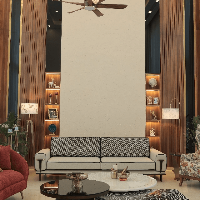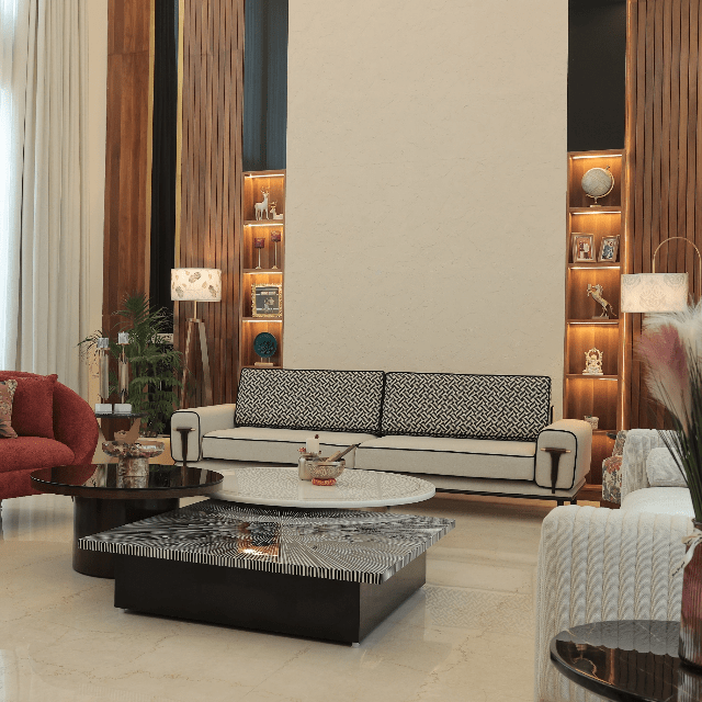 Explore modern and functional living and dining spaces with double-height ceilings with veneer and glass finishes. Whether it’s the sleek, curved, rust sofa or the two straight line sofas with exquisite quilting and prints, every piece of furniture has its own character to light up the space. Get customised aesthetic interior decor at your fingertips only at Lakkadworks!