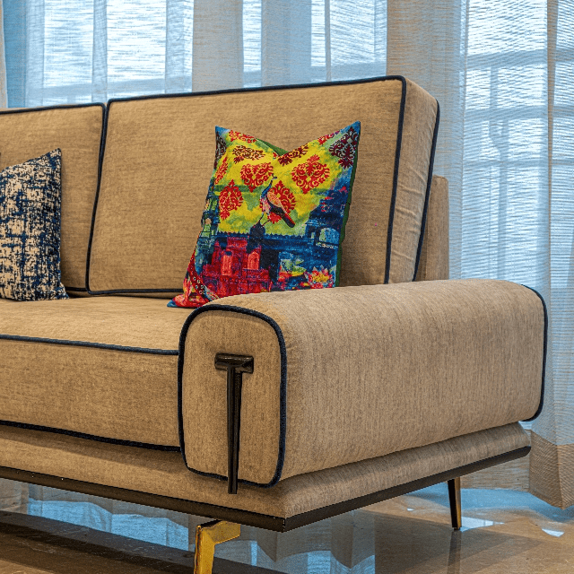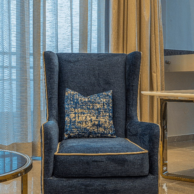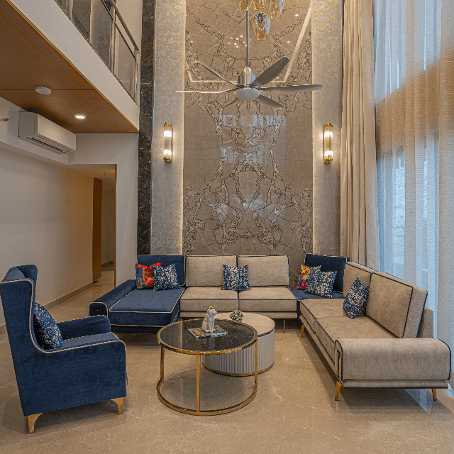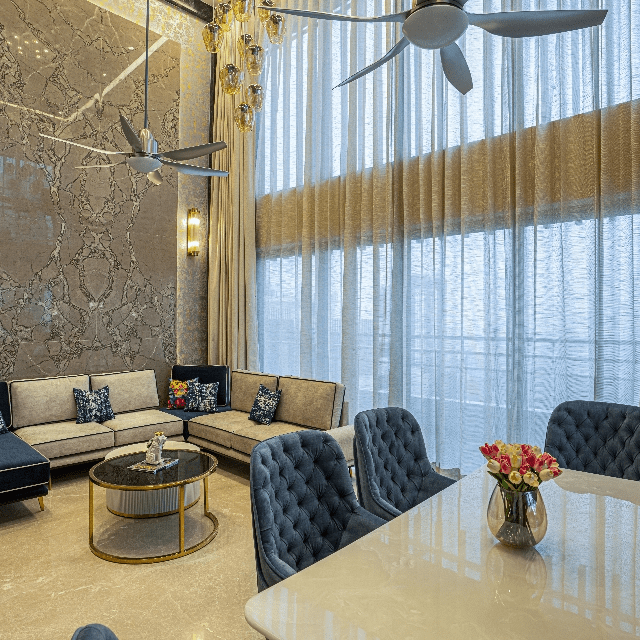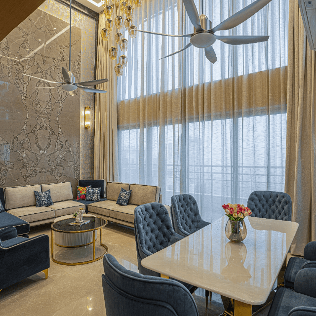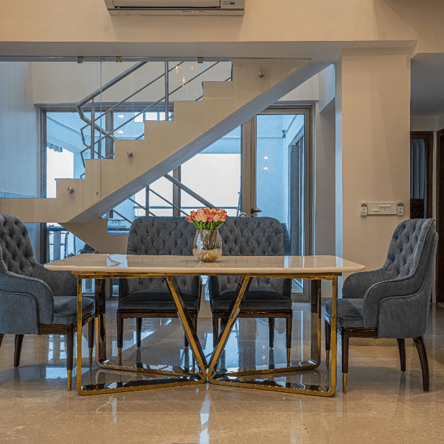 Explore the beauty of the creative interior with our customised living and dining spaces, featuring a double-height ceiling with exquisite marble cladding. Experience the beauty of custom furniture in the living area as we have installed a U-shaped custom-designed sofa with metal details, a centre table in a stunning fusion of stone and glass, and an accent chair in a beautiful shade of blue. The dining area perfectly complements the overall interior with a table with a stainless-steel base and an Italian stone top. Let’s explore a living and dining experience like never before only at Lakkadworks!